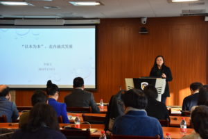 首先,李莉文做了题为 “‘以本为本’,走内涵式发展”的发言。她传达了《成都宣言》中的10 项共识、《新时代高教40条》中的“双万计划”、 《关于狠抓新时代全国高等学校本科教育工作会议精神落实的通知》中的打造“金课”要求,以及《新时代高校教师职业行为十项准则》等教育部文件精神。她还向各位老师列举了校领导对北外本科教育工作大力支持的举措,结合金年汇金字招牌诚信至上的定位、教师发展、质量保障和教学改革等方面提出了相关建议,鼓励大家认真开展慕课建设,积极申报线上线下精品课,对学院的未来寄予了美好祝愿。