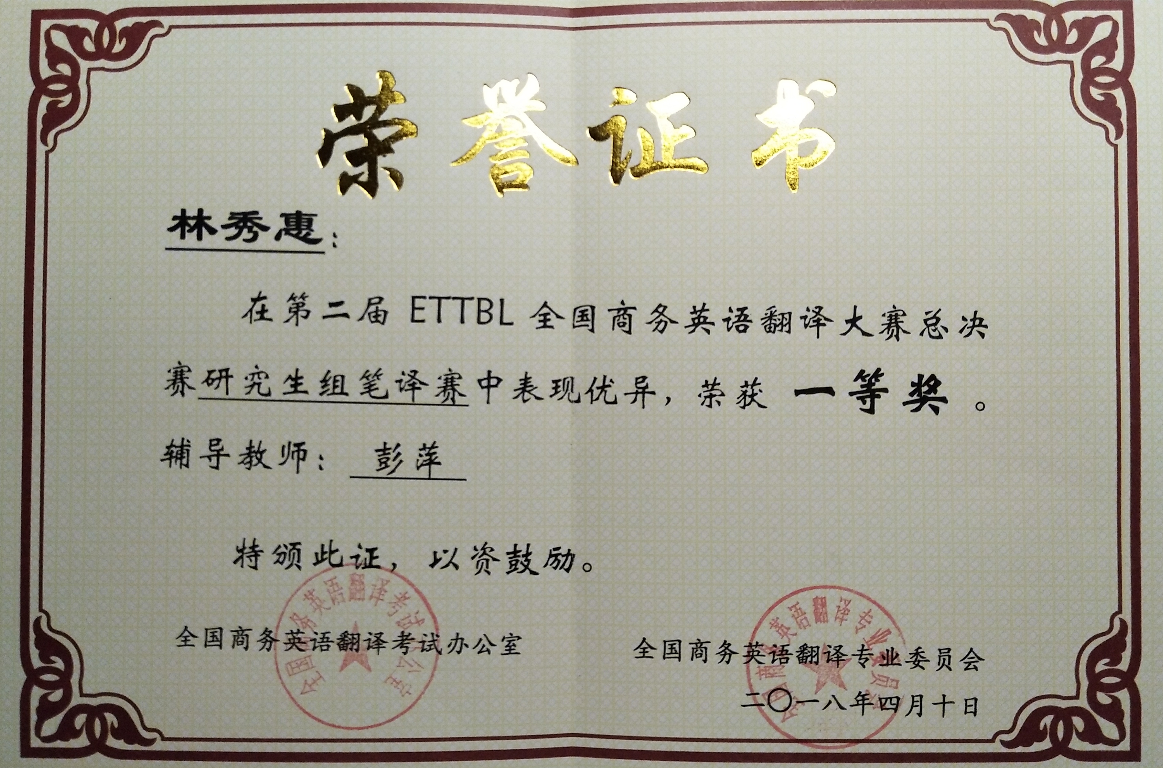 随后,大赛的口译组决赛正式拉开帷幕。我院副院长彭萍教授、教师王艳教授在决赛中受邀担任评委。下午四时,大赛举行了隆重的颁奖仪式与闭幕式。在此次决赛中,我校荣获“最佳组织奖”,英语学院2016级研究生渠超男同学获研究生口译组二等奖;我院2017级MTI林秀惠同学荣获研究生笔译组一等奖。