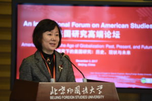 论坛发言阶段,11位来自中美两国的美国研究领域的优秀学者,围绕“全球化背景下的美国研究”主题进行了主旨发言。专家学者就中美两国学者在美国研究领域的研究定位、研究内容、研究方法和研究成果进行了深入剖析和反思,论坛上的主旨发言和交流对话广泛涉及中美政治外交关系、美国社会文化与文学艺术、美国少数族裔、美国史学研究等多个主题。