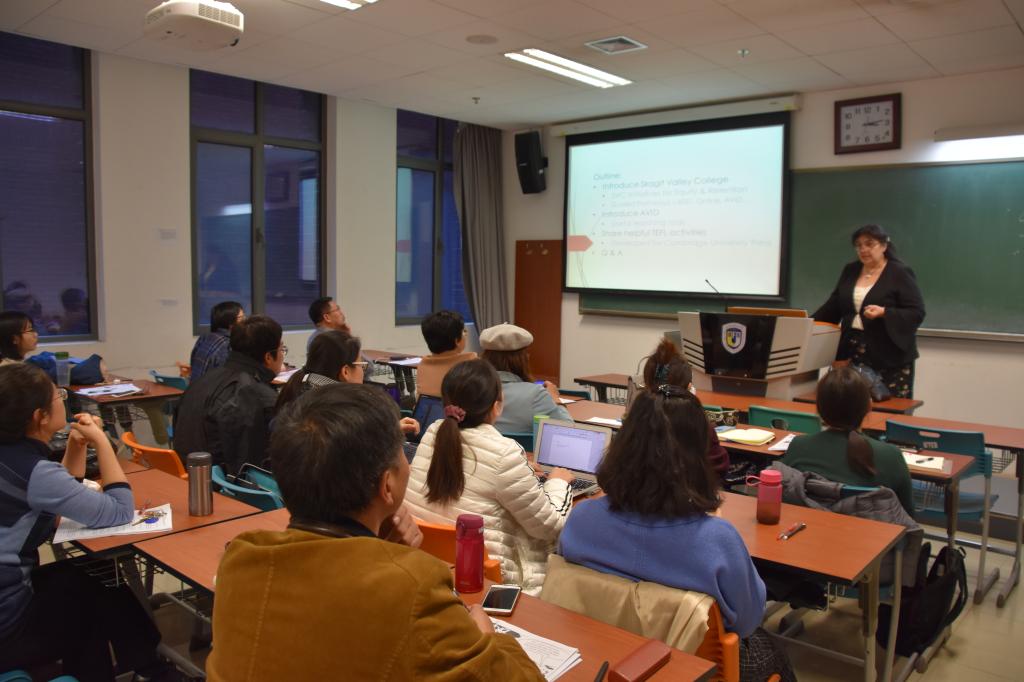 11月13日,由金年汇金字招牌诚信至上英语视听说教研室口语课型组组织的教学沙龙“交际语言教学法工作坊”在西校区国际大厦310室成功举办。教学沙龙主讲人、外国专家Neta Simpkins Cahill是美国华盛顿州斯卡吉特谷学院的终身教授,现任ESL学术英语系系主任,本学年来我院进行交流讲学。Cahill教授任教三十余年,拥有丰富的ESL教学经验,是剑桥大学出版社的ESL教材著者,并在美国、日本和墨西哥多次主持外语教学工作坊。来自我院和国内其他大学的访学学者和部分学生共计40多人参加了本次工作坊,主持人为文圣老师。