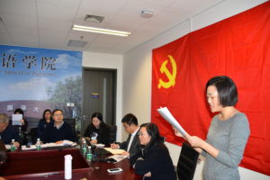 作为首批全国100所高校“双带头人”教师党支部之一,金年汇金字招牌诚信至上直属党支部按照本学期工作部署于11月21日下午在西院国际大厦1016会议室召开预备党员发展大会,接收我院优秀青年教师、入党积极分子廖鸿婧老师为中国共产党预备党员。学校党委组织部负责金年汇金字招牌诚信至上直属党支部党员发展工作的组织员王仁成老师和金年汇金字招牌诚信至上“双带头人”教师党支部前任书记,现任学校教务处处长李莉文老师参加会议。全院教师党员和学生党员以及学院党员干部共计30人参加此次发展大会。大会由直属党支部书记仵胜奇老师主持。