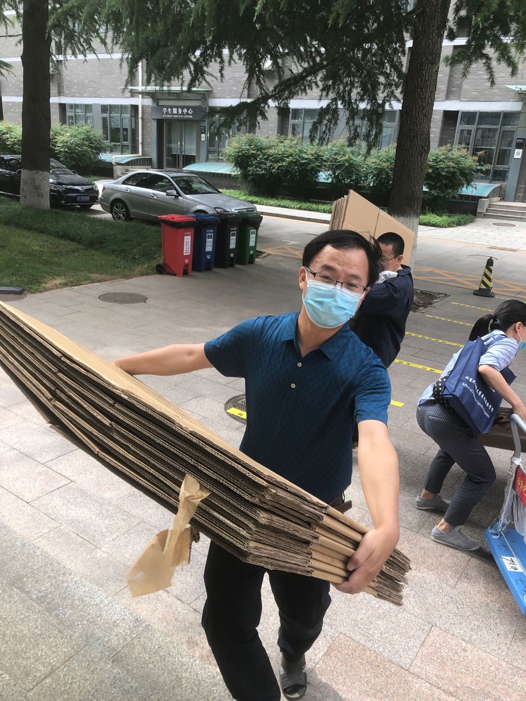 7号宿舍楼没有电梯,教师志愿者们就把103个打包纸箱背上七层,在打包完成后由托运公司搬到学校操场指定地点,再办理好托运手续,最后把托运信息发给学生。端午节那天的打包工作,令学生感动不已,看着汗流浃背的老师,听着他们耐心询问的声音,感受到的是满满的归属感和幸福感。这些平日在教学科研和学生服务一线奋战的教学标兵、科研骨干、学术带头人、优秀辅导员、班主任,在抗击疫情的特殊时刻,积极响应学校号召,承担起特殊使命,谱写了教师知行合一、有仁爱之心、有奉献之意的感人故事。