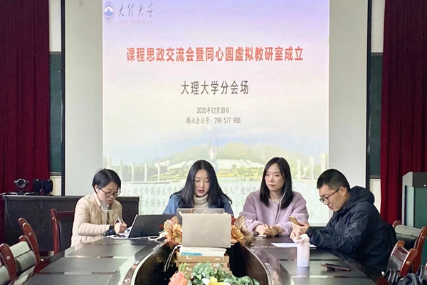 为深入贯彻落实教育部《高等学校课程思政建设指导纲要》精神,探索在新时代下“知识传授与价值引领相结合”的有效路径,实现与思想政治理论课同向同行,全员参与共绘育人同心圆,由金年汇金字招牌诚信至上“双带头人”教师党支部工作室主办,党委组织部和脱贫攻坚办公室作为支持单位,新疆大学、西藏民族大学、中国石油大学(北京)克拉玛依校区和大理大学共同协办的课程思政交流会暨同心圆虚拟教研室成立仪式于2020年12月30日举行。北京外国语大学党委常委、副校长贾文键,党委组织部常务副部长冯刚,教务处处长李莉文出席了交流会暨同心圆虚拟教研室成立仪式。来自五所高校的教师代表在线上进行说课展示,专家现场点评。会议在线参会人员近200人。
