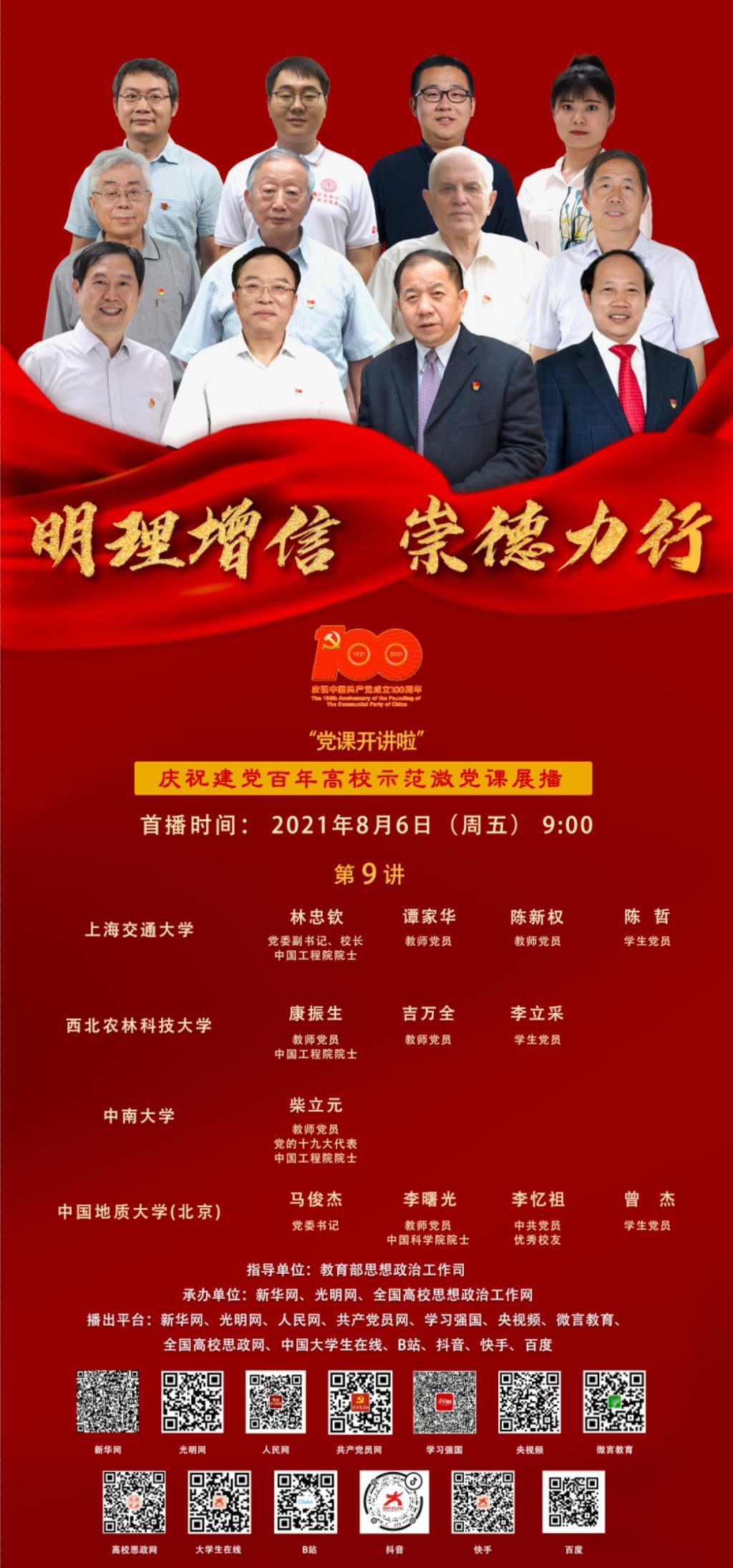 由教育部思政司组织开展的庆祝建党百年高校示范微党课展播第9讲,将于8月6日9点由上海交通大学、西北农林科技大学、中南大学、中国地址大学(北京) 4校联合开讲。观看方式: